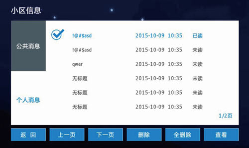 1)存儲(chǔ)管理中心發(fā)布的小區(qū)公共消息與個(gè)人消息,包括標(biāo)題、時(shí)間、已讀未讀,可點(diǎn)擊查看詳細(xì)的信息內(nèi)容,也可進(jìn)行刪除與全