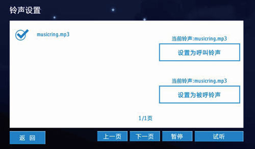 1)支持呼叫鈴聲與被叫鈴聲的設(shè)置,可以試聽當(dāng)前選定的鈴聲,也支持外接SD卡鈴聲,路徑為SD卡根目錄ring文件夾,如圖3.7.3: