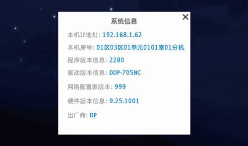 1)可查看本機(jī)編號(hào),IP地址、子網(wǎng)掩碼、網(wǎng)關(guān)地址,程序版本信息,出場(chǎng)商和網(wǎng)絡(luò)配置表,如圖3.7.2: