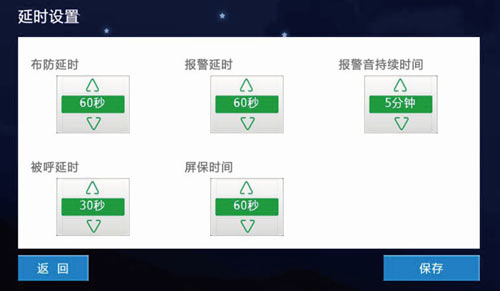 1)設(shè)置布防延時(shí),報(bào)警延時(shí),報(bào)警音持續(xù)時(shí)間,被呼延時(shí),屏保時(shí)間。布防延時(shí)選項(xiàng)為30S,60S,99S。報(bào)警延時(shí)選項(xiàng)為0S,30S,60S。報(bào)警音持續(xù)時(shí)間選項(xiàng)為3M,5M,10M。被呼延時(shí)選項(xiàng)為30s,60S,90S.屏保時(shí)間選項(xiàng)為30S,60S,90S。設(shè)置界面如圖3.7.8: