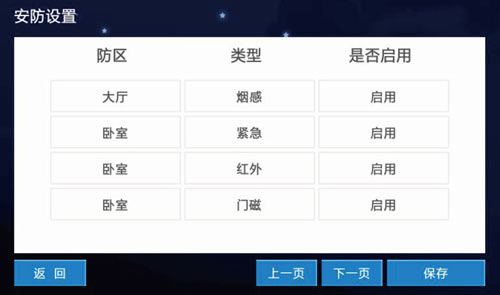 1)設(shè)置八防區(qū)的地點(diǎn),類型和是否啟用,下一頁可查看下一頁的防區(qū)設(shè)置,點(diǎn)擊保存可保存防區(qū)信息的設(shè)置,如圖3.8.2:
