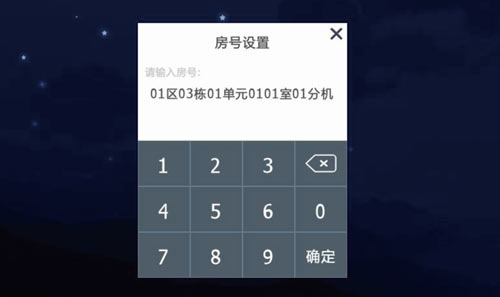 1)設(shè)置當(dāng)前設(shè)備的房號(hào),包括XX區(qū)XX棟XX單元XXXX室XX分機(jī)等信息,例如設(shè)置為01區(qū)03棟01單元0101室01分機(jī),點(diǎn)擊確定保存,如圖3.8.3: