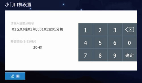 1)設(shè)置本戶門前別墅機(jī)的房號(hào)以及開鎖延時(shí),室內(nèi)機(jī)出廠時(shí)房號(hào)為19999990101,別墅機(jī)為3999999010101,此時(shí)可將設(shè)備直連網(wǎng)絡(luò)來設(shè)置別墅機(jī)的房號(hào)以及開鎖延時(shí),如圖3.8.4: