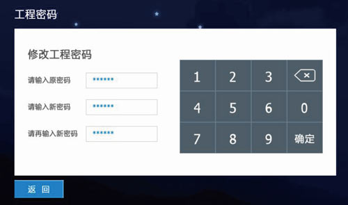 1)輸入6位舊密碼,再輸入兩次相同新密碼設(shè)置新的工程密碼,默認(rèn)出廠時(shí)的工程密碼為“666666”如圖3.8.5: