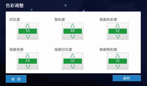 1)可設(shè)置屏幕的對(duì)比度、飽和度、視頻色彩度,通信視頻流的亮度、對(duì)比度、飽和度,參數(shù)的設(shè)置范圍為1-100,如圖3.8.8: